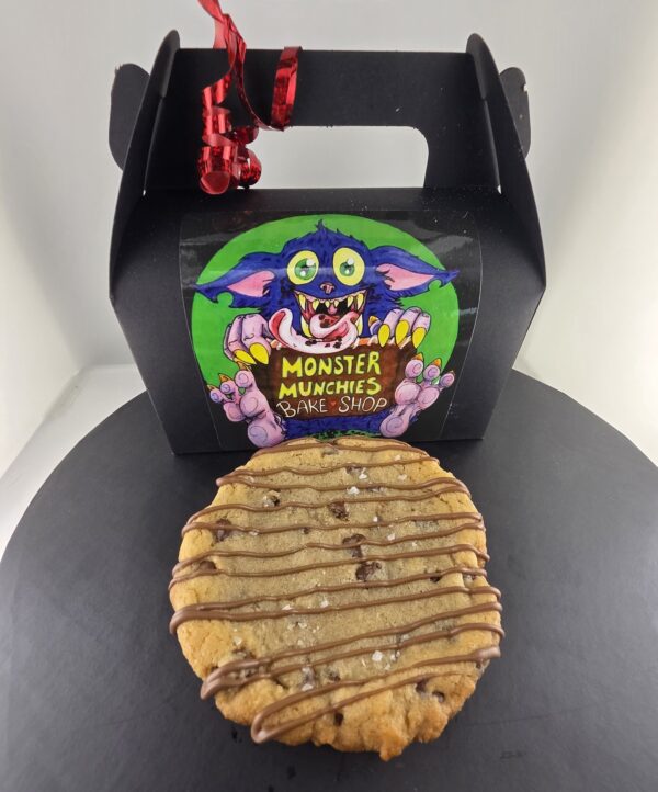 delicious chewy chocolate chip cookie loaded with lots of chocolate chips and finished with sea salt flakes and a drizzle of milk chocolate